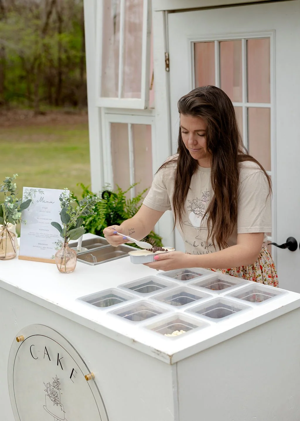 Great question! First we gather information about your event like guest count, date, and flavors you want to offer. After we finalize your package, we get to work behind the scenes baking and prepping! On the day of the event, we arrive 15-30 minutes before the requested time to set up. After that — we’re off to the races! Guests can then customize their own mini cake in the 4 step process: 1. Choose their cake flavor 2. Choose their buttercream flavor 3. Pick their toppings — there are 9 to choose from! 4. Add some drizzle.